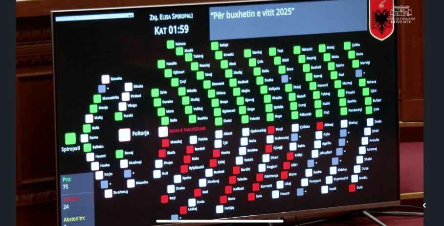Me 75 vota pro të mazhorancës dhe 24 kundër të opozitës, Kuvendi ka miratuar në tërësi buxhetin për vitin 2025.