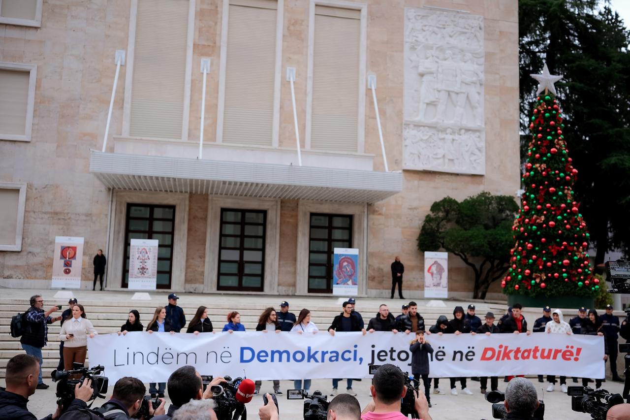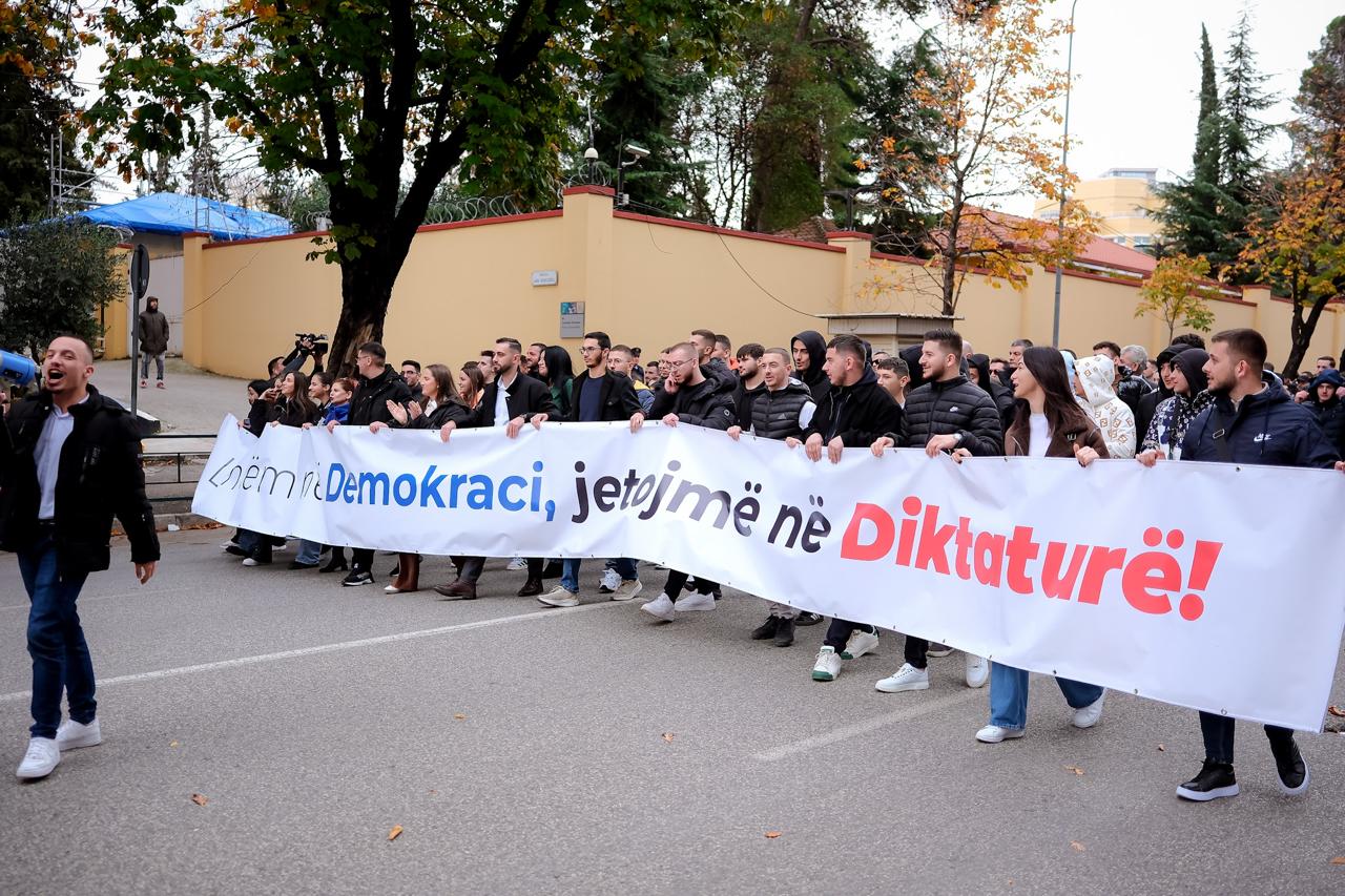 Të rinjtë mbajnë në duar pankarta ku lexohet “Lindëm në Demokraci, jetojmë në diktaturë”.