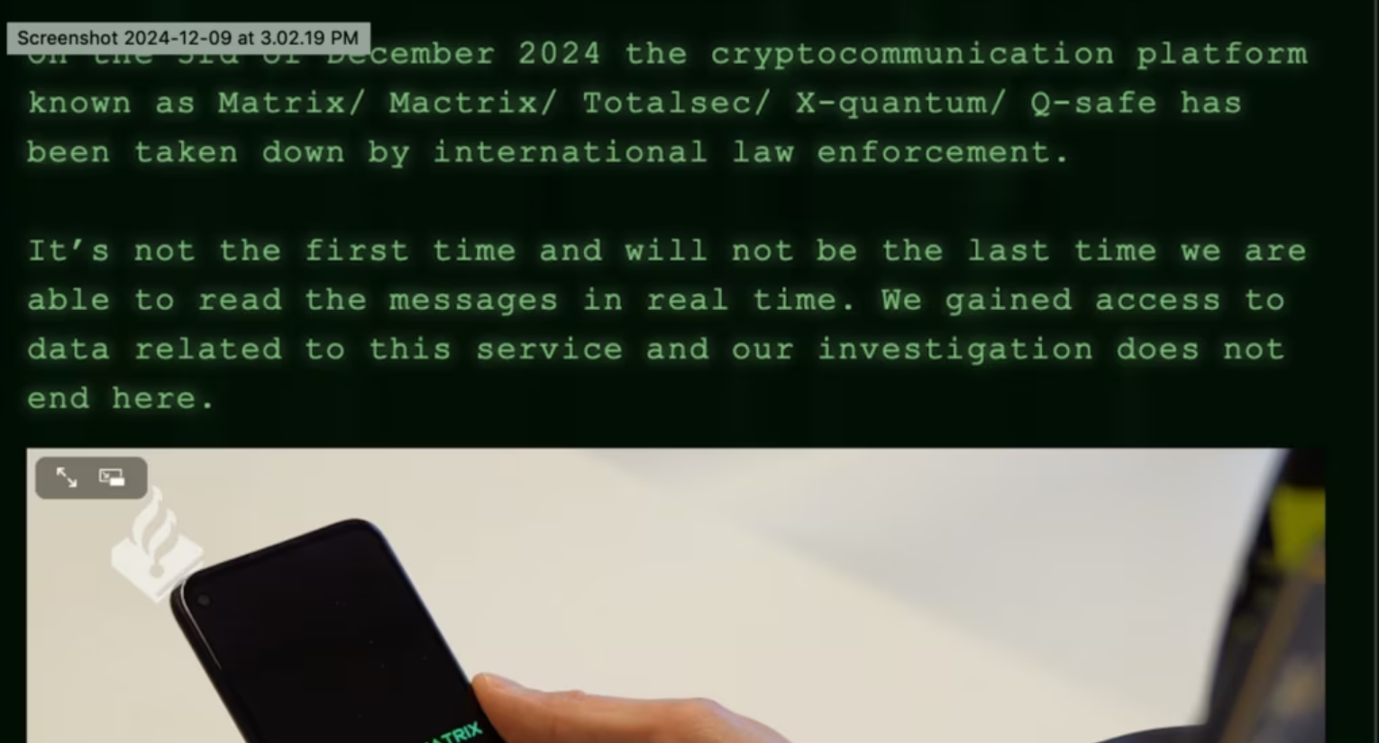 Sipas EUROPOL , një shërbim mesazhesh i bërë nga kriminelët për kriminelët, MATRIX, u zbulua për herë të parë nga autoritetet holandeze në telefonin e një krimineli të dënuar për vrasjen e një gazetari holandez në vitin 2021.