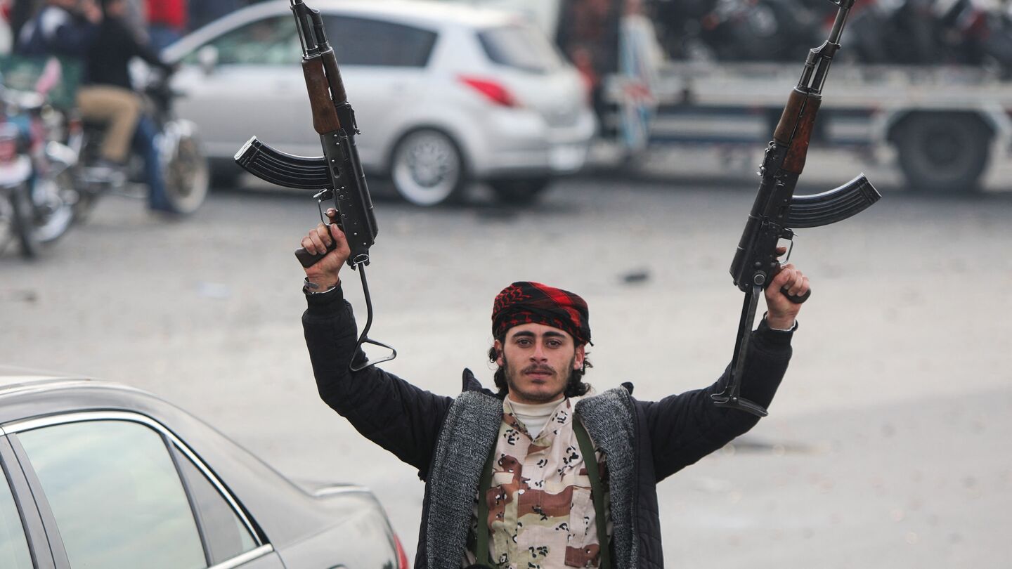Një luftëtar anti-qeveritar feston në sheshin Umajad në Damask më 8 dhjetor 2024. Festimet shpërthyen rreth Sirisë dhe turmat plaçkitën shtëpinë luksoze të Presidentit Bashar al-Assad më 8 dhjetor pasi rebelët e udhëhequr nga islamistët hynë në Damask dhe deklaruan se ai kishte ikur nga vendi, në një fund spektakolar të pesë dekadave të sundimit të partisë Baath. (Foto nga Bakr AL KASSEM / AFP)