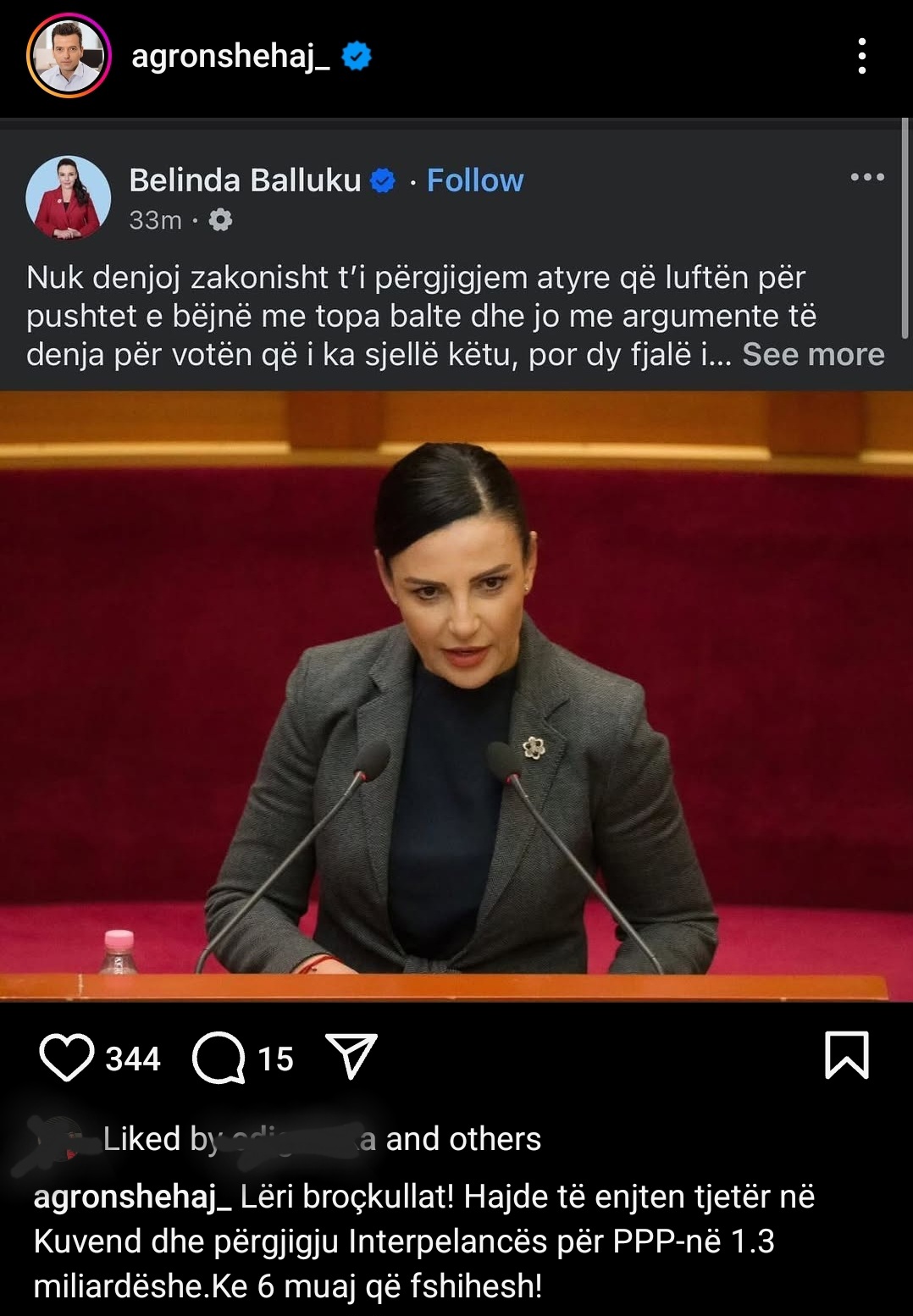 Deputeti Agron Shehaj i është përgjigjur zv.kryeministres Belinda Balluku e cila sot e ironizoi se mori raport mjekësor kur ajo ishte në parlament për interpelancën që ishte kërkuar prej tij.