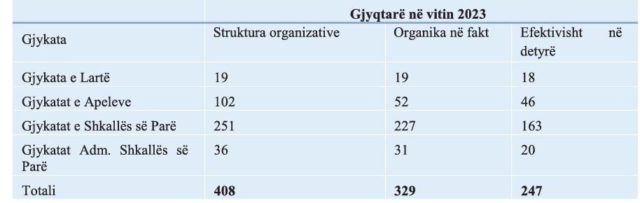 Sistemi gjyqësor në Shqipëri vijon të përballet me sfida të mëdha, ndërsa procesi i rivlerësimit kalimtar ka nxjerrë në pah probleme të thella strukturore, duke krijuar edhe kosto të mëdha financiare për buxhetin e shtetit. Në vitin 2023, sistemi gjyqësor ka funksionuar me vetëm 60% të kapacitetit të tij, duke shënuar një rritje të lehtë prej 4.7% krahasuar me vitin 2022. Kjo rritje është rezultat i emërimeve të magjistratëve të rinj, të cilët kanë përfunduar programin e formimit fillestar pranë Shkollës së Magjistraturës gjatë vitit akademik 2022-2023.