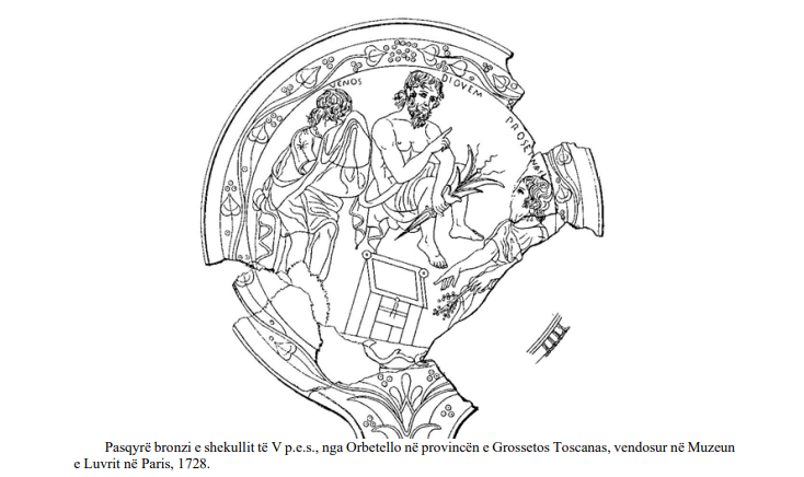 Pasqyrë bronzi e shekullit të V p.e.s., nga Orbetello në provincën e Grossetos Toscanas, vendosur në Muzeun e Luvrit në Paris, 1728.