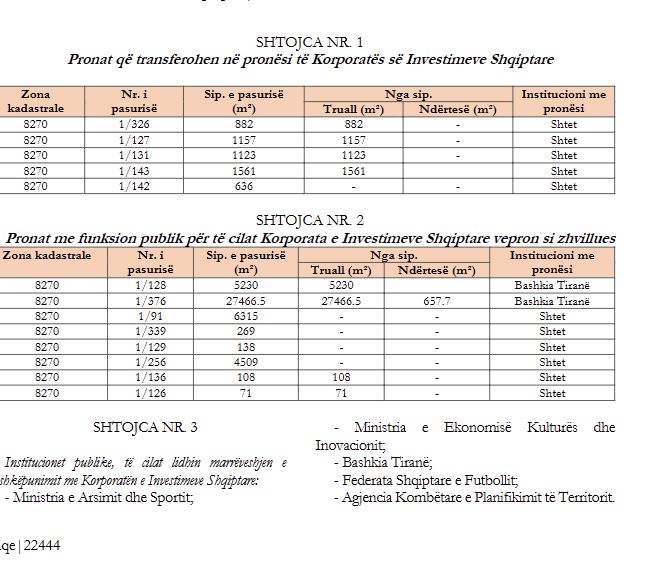 Ky vendim shoqërohet tashmë edhe me shtojcat për pronat konkrete që kalojnë për këtë projekt, të cilat pjesa më e madhe janë në pronësi shtetërore dhe dy prej tyre në pronësi të Bashkisë së Tiranës. Janë të paktën 13 numra pasurish të përfshira në dy shtojca specifike që përfshijnë disa dhjetëra mijë m3 sipërfaqe.