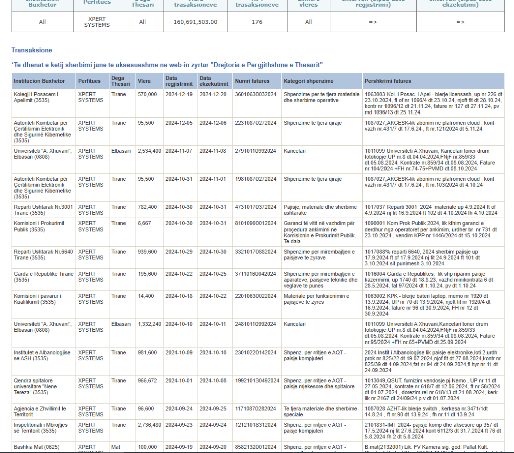 Në një deklaratë për shtyp ajo sqaroi se kompania Xpert systems shpk, për periudhën 2019-2024 ka përfituar 1.6 milion euro nga institucione shtetërore përfshirë Drejtorinë Rajonale Tatimore Tiranë, Shërbimin e Kontrollit të Brendshëm në MB, Drejtorinë e Policisë Vendore Elbasan, Gjykata e Rrethit Tiranë, Kolegji i Posaçëm i Apelimit, Autoriteti Kombëtar për Certifikimin Elektronik dhe Sigurinë Kibernetike etj.