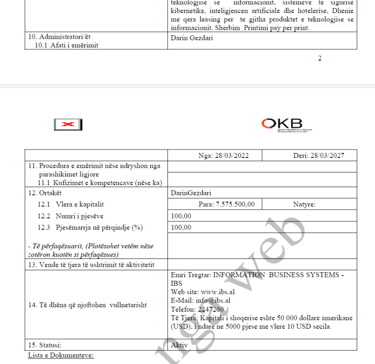 ‘INFORMATION BUSINESS SYSTEMS –IBS shpk’ është kompania tjetër ku pronar aktiv vijon të jetë i njëjti shtetas.