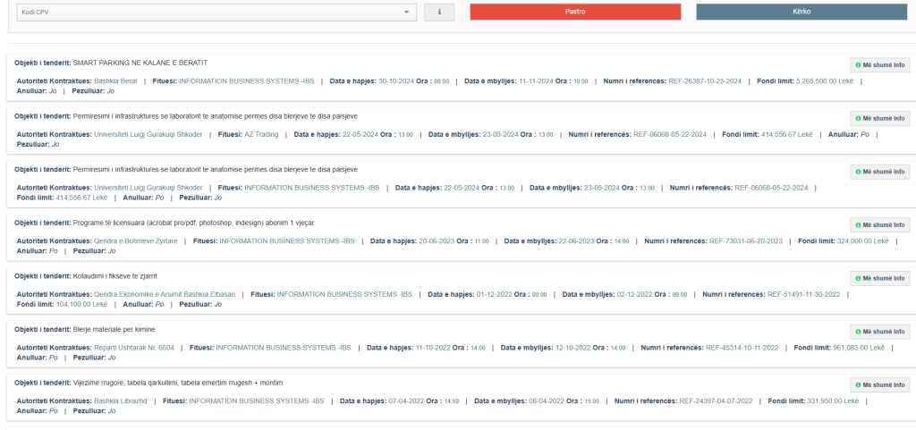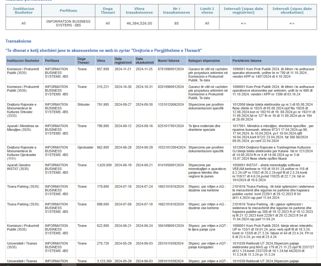 Ndërkohë kompania tjetër, ‘INFORMATION BUSINESS SYSTEMS –IBS shpk’, sipas PD, ka përfituar 463 mijë euro nga Drejtoria e Përgjithshme e Parandalimit e Pastrimit te Parave, Aparati i Drejtorisë së Policisë, Prokuroria e Posaçme Kundër Korrupsionit dhe Krimit të Organizuar etj.