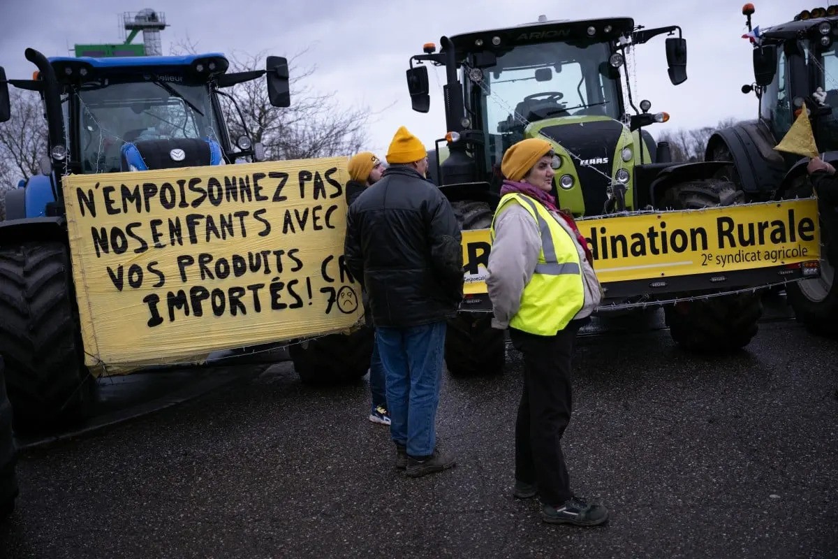 Anëtarët e sindikatës së Bashkërendimit Rural protestojnë kundër marrëveshjes së tregtisë së lirë Mercosur me vendet e Amerikës së Jugut, të rënë dakord nga Bashkimin Evropian muajin e kaluar, pavarësisht kundërshtimeve të Francës, duke kërkuar kompensim më të mirë.