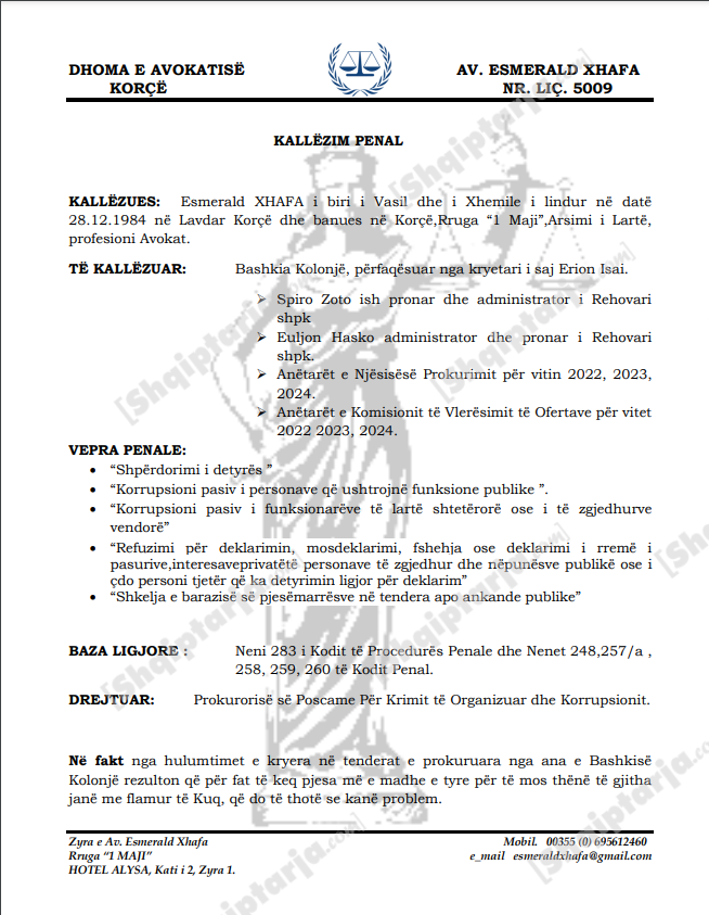 Isai është kallëzuar nga Esmerald Xhafa, i cili dyshon se ai ka kryer veprime të paligjshme, përfshirë ‘Shpërdorimin e detyrës’, ‘Korrupsionin pasiv dhe aktiv’, ‘Fshehjen e pasurisë’, dhe ‘Shkelje të barazisë së pjesëmarrësve në tendera dhe ankande publike’, raporton Shqiptarja.com.