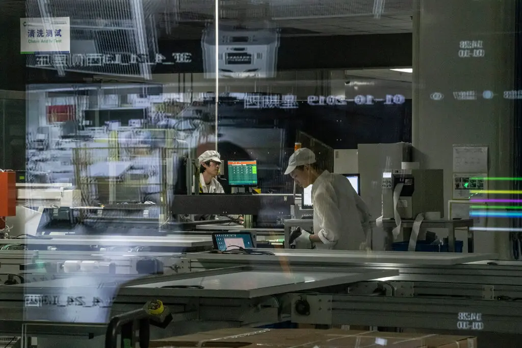 Punëtorët fabrike në një linjë prodhimi të paneleve diellore në Suzhou, Kinë. Fabrikat kineze po dominojnë prodhimin global në një shkallë që asnjë vend nuk e ka përjetuar që nga Shtetet e Bashkuara pas Luftës së Dytë Botërore