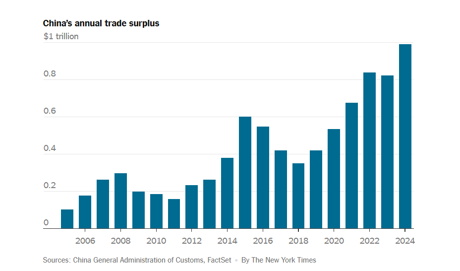 Suficiti tregtar i Kinës vitin e kaluar tejkaloi shumë atë në botë gjatë shekullit të kaluar, madje edhe ato të superfuqive eksportuese si Gjermania, Japonia apo Shtetet e Bashkuara. Fabrikat kineze po mbizotërojnë prodhimin global në një shkallë që asnjë vend nuk e ka përjetuar që nga Shtetet e Bashkuara pas Luftës së Dytë Botërore.