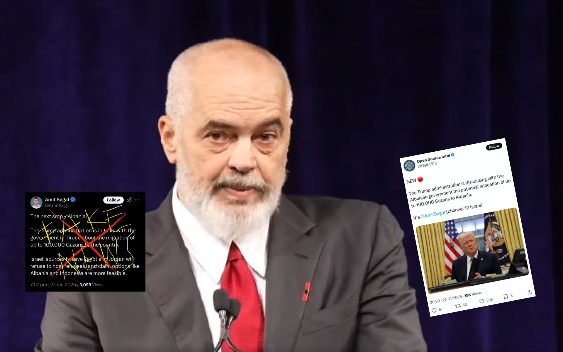 “Administrata e Trumpit është në diskutime me qeverinë shqiptare për mundësinë e zhvendosjes së 100 mijë palestinezëve të Gazës në Shqipëri”-thuhet në postimin e Open Source Intel.