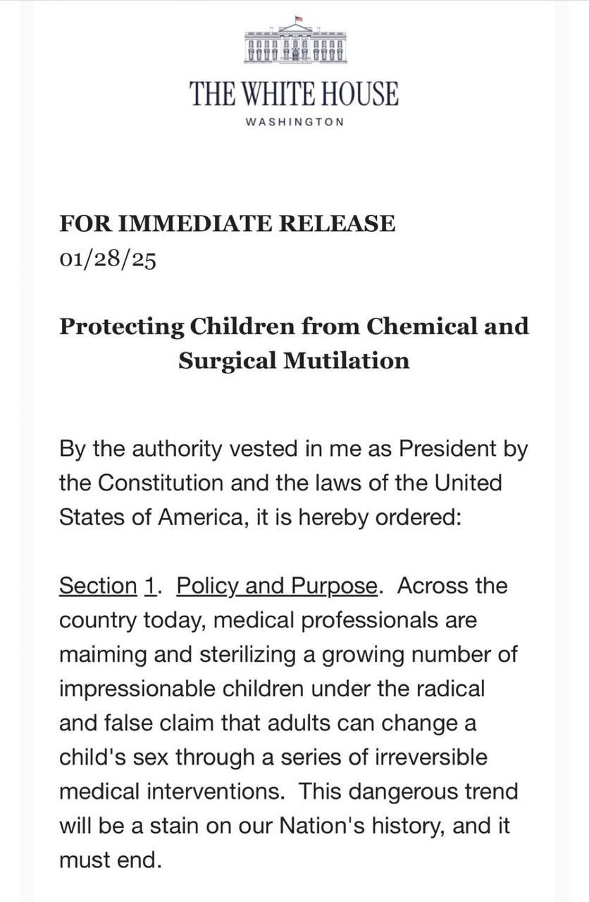 Në urdhër, Trump tha se mbështetja federale për një kujdes të tillë do përfundojë. Ai i bëri thirrje Sekretarit të Shëndetësisë dhe Shërbimeve Njerëzore që “të ndërmarrin të gjitha veprimet e duhura për t’i dhënë fund gjymtimit kimik dhe kirurgjikal të fëmijëve”.