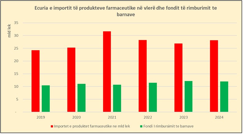 Në 2024 fondi për rimbursimin e barnave zuri 42.6% të vlerës së importeve nga 45% që zinte një vit më parë. Importet e barnave në vlerë kanë shënuar rritje me 16% ndërmjet 2019 dhe 2024, por burimet nga tregu pohojnë se nevojat e popullatës për produkte farmaceutike janë shumë më të larta se importet.