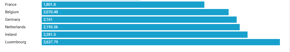 -Mbi 1 500 € në muaj: Ky grup përfshin Luksemburgun, Irlandën, Holandën, Gjermaninë, Belgjikën dhe Francën. Paga minimale kombëtare në këto vende varionte nga 1 802 € në Francë deri në 2 638 € në Luksemburg.