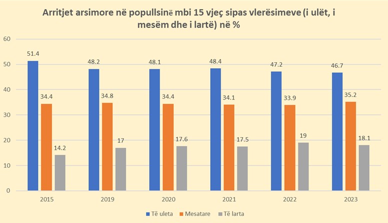 Afërsisht 47% e popullsisë mbi 15 vjeç në Shqipëri ka arritje të ulëta arsimore dhe një pjesë tjetër 35.2% vlerësohet se kishte njohuri mesatare në vitin 2023, evidentojnë të dhënat statistikore të Fondit Europian të Trajnimeve (ETF) një njësi që operon me financime të KE-së për politika që kanë të bëjnë me kapitalin njerëzor në vendet europiane që nuk janë ende pjesë e BE-së.
