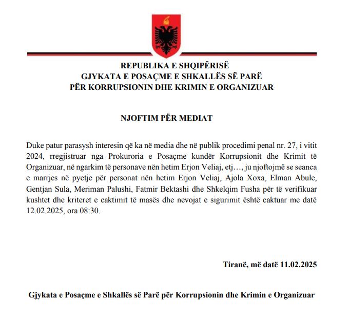 “Duke patur parasysh interesin që ka në media dhe në publik procedimi penal nr. 27, i vitit 2024, rregjistruar nga Prokuroria e Posaçme kundër Korrupsionit dhe Krimit të Organizuar, në ngarkim të personave nën hetim Erjon Veliaj, etj…, ju njoftojmë se seanca e marrjes në pyetje për personat nën hetim Erjon Veliaj, Ajola Xoxa, Elman Abule, Gentjan Sula, Meriman Palushi, Fatmir Bektashi dhe Shkëlqim Fusha për të verifikuar kushtet dhe kriteret e caktimit të masës dhe nevojat e sigurimit është caktuar me datë 12.02.2025, ora 08:30”, sipas njoftimit.