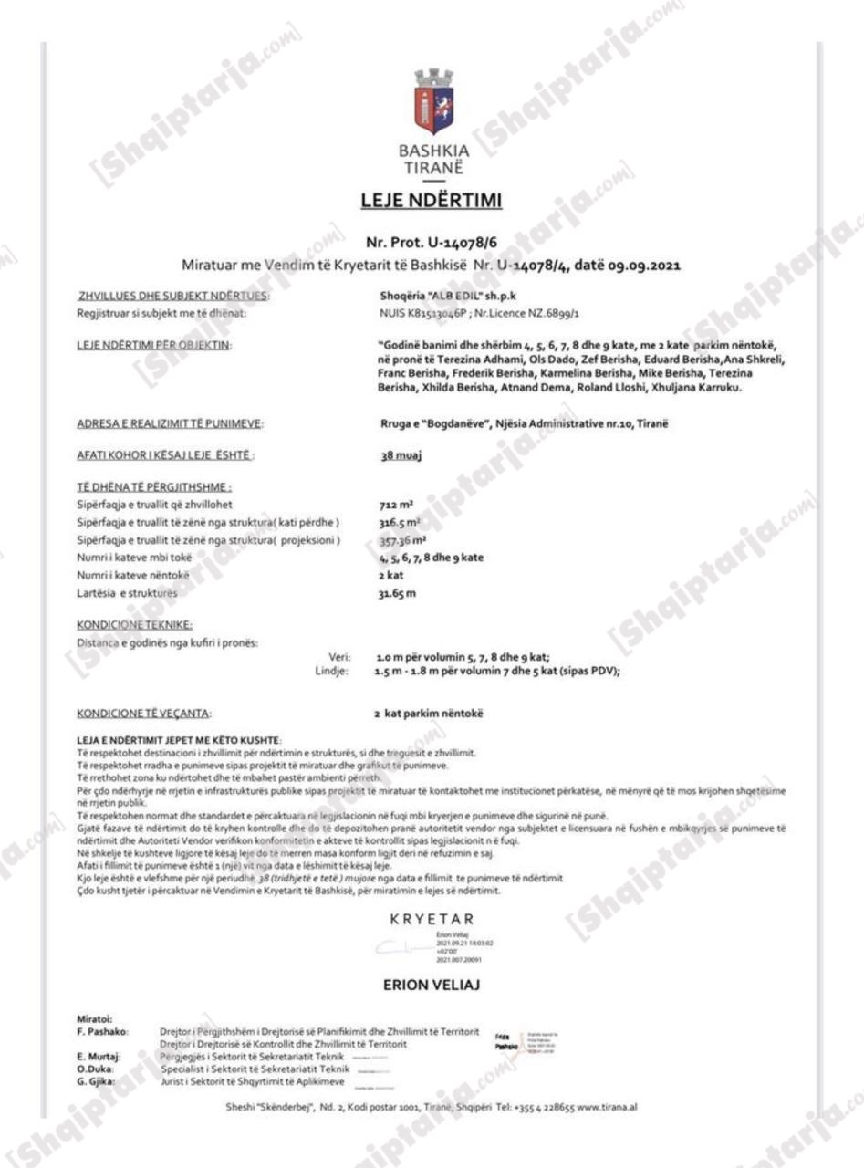 Në lejen e ndërtimit e miratuar nga kryetari i Bashkisë së Tiranës, Erion Veliaj, thuhet se: “Godinë banimi dhe shërbim 4, 5, 6, 7, 8 dhe 9 kate, me dy kate parkim nëntokë në pronë të Terezina Adhami, Ols Dado, Zef Berisha, Eduard Berisha, Ana Shkreli, Franc Berisha, Frederik Berisha, Karmelina Berisha, Mike Berisha, Terezina Berisha, Xhilda Berisha, Atnand Dema, Roland Roshi, Xhuljana Karruku”, me sipërfaqe trualli që zhvillohet 712 m2.