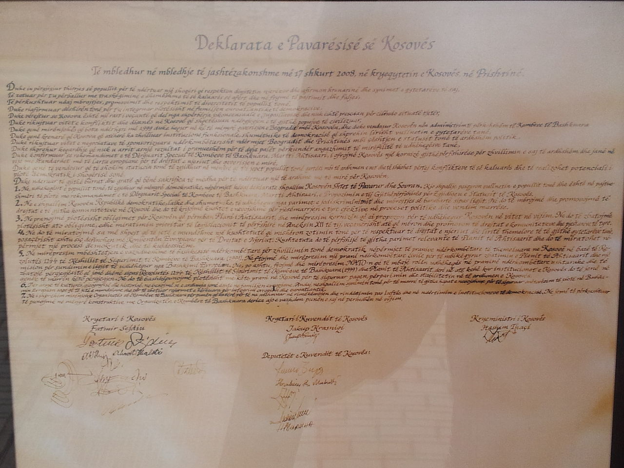“Ne, udhëheqësit e popullit tonë, të zgjedhur në mënyrë demokratike, nëpërmjet kësaj Deklarate shpallim Kosovën shtet të pavarur dhe sovran. Kjo shpallje pasqyron vullnetin e popullit tonë dhe është në pajtueshmëri të plotë me rekomandimet e të Dërguarit Special të Kombeve të Bashkuara, Martti Ahtisaari, dhe Propozimin e tij Gjithëpërfshirës për Zgjidhjen e Statusit të Kosovës.”