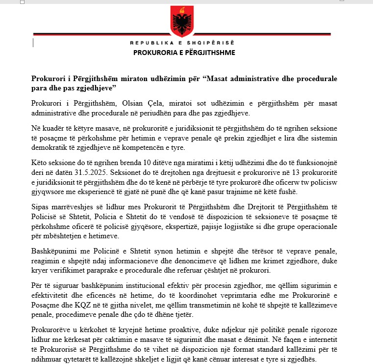 Prokurori i Përgjithshëm, Olsian Çela, miratoi sot udhëzimin e përgjithshëm për masat administrative dhe procedurale në periudhën para dhe pas zgjedhjeve të majit.