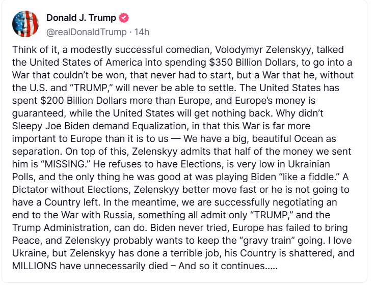 Në një postim në median e tij Truth Social, Trump nënvizoi se SHBA-të kanë shpenzuar 200 miliardë më shumë se Evropa në luftën e Ukrainës duke shtuar se ndërsa Evropa i ka siguruar lekët e veta, SHBA-të nuk do marrin asgjë nga ato që kanë shpenzuar.