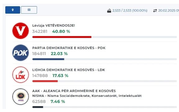 Ka përfunduar numërimi i të gjitha votave nga zgjedhjet parlamentare të mbajtura më 9 shkurt në Kosovë. Komisioni Qendror Zgjedhor ka përditësuar rezultatet përfundimtare, duke konfirmuar se Lëvizja Vetëvendosje (LVV) ka dalë forcë e parë me 342,281 vota, ose 40.80% të votave.
