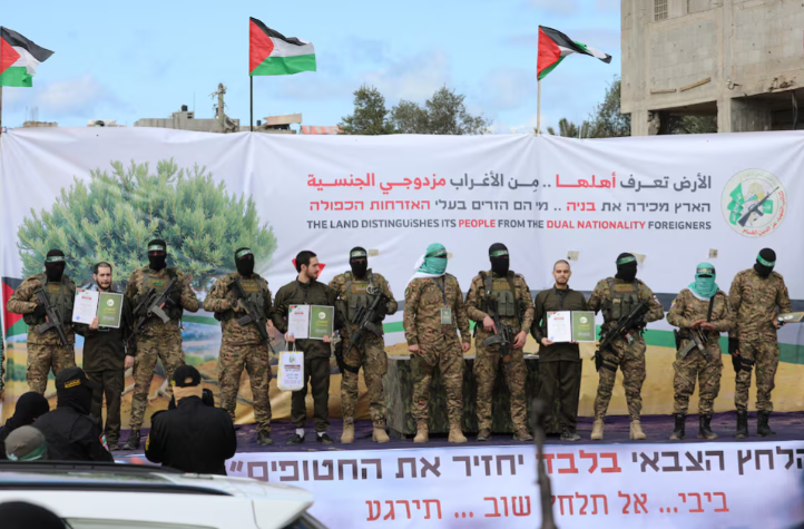Dhjetra militantë të maskuar qëndruan roje në një turmë që ishte mbledhur për të parë dorëzimin, ndërsa trupat e Hamasit të armatosur qëndronin në secilën anë të tre pengjeve, të cilët dukeshin të dobët dhe të zbehtë.