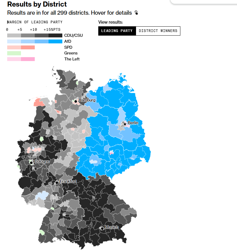 Alternativa e ekstremit të djathtë për Gjermaninë, ose AfD, dyfishoi mbështetjen duke u bërë partia e dytë më e fortë me 20.8%, megjithatë ajo nuk ka një pakicë bllokuese më vete. Lëvizja nacionaliste do jetë partia mbizotëruese e opozitës në dhomën e ulët të parlamentit, por do ketë pak fuqi konkrete pasi Merz përjashtoi një aleancë me të, pavarësisht presionit nga zyrtarët amerikanë për të hedhur mënjanë të ashtuquajturin “mur zjarri” i ngritur për t’i mbajtur ata jashtë qeverisë.