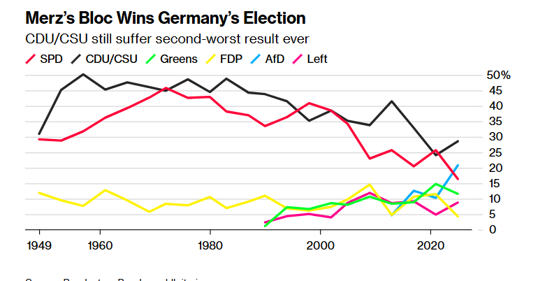Politika gjermane është bërë gjithnjë e më e copëtuar, me pesë parti që kanë hyrë në Bundestag këtë herë dhe dy të tjera që pothuajse e kaluan pragun e nevojshëm për të hyrë. Ndërsa numri i partive shtohet, aftësia e atyre në qendër për të formuar një qeveri të qëndrueshme dhe për të shtyrë reformat më të thella është bërë më e vështirë.