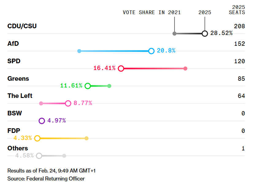 Konservatorët e Gjermanisë nën Friedrich Merz fituan zgjedhjet e parakohshme të së dielës në Gjermani me 28.5% të votave, sipas rezultateve të përkohshme nga autoritetet.