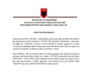 Gjykata e Posaçme AntiKorrupsion ka reaguar pas publikimit nga kryebashkiaku Erion Veliaj i transkriptimit të replikave gjatë seancës gjyqësore të 12 Shkurtit ku iu caktuar masa e sigurisë “arrest me burg”.