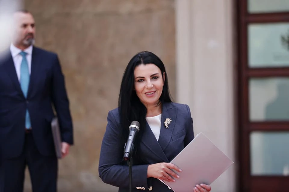 Belinda Balluku gjatë një konference për shtyp, më 26 maj 2022, ku deklaroi miratimin e kontratës të koncesionit për aksit rrugor Thumanë-Kashar