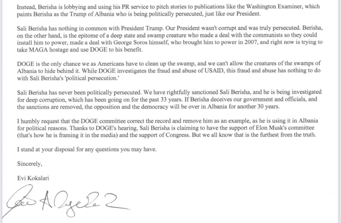 Kërkoj me përulësi që komiteti DOGE të korrigjojë procesverbalin dhe ta heqë si shembull, pasi ai e përdor atë në Shqipëri për arsye politike. Falë seancës dëgjimore të DOGE, Sali Berisha pretendon të ketë mbështetjen e komitetit të Elon Musk (kështu po e inkuadron në media) dhe mbështetjen e Kongresit. Por ne të gjithë e dimë se kjo është shumë larg së vërtetës”. – shkruan Kokalari.