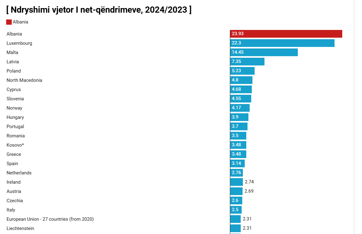 Shteti i dytë me rritjen më të lartë pas Shqipërisë ishte Luksemburgu (22.4%), i ndjekur nga Malta (14.4%). Këto janë vendet e vetme që shënuan rritje dy shifrore të net-qëndrimeve në Europë në 2024-n.