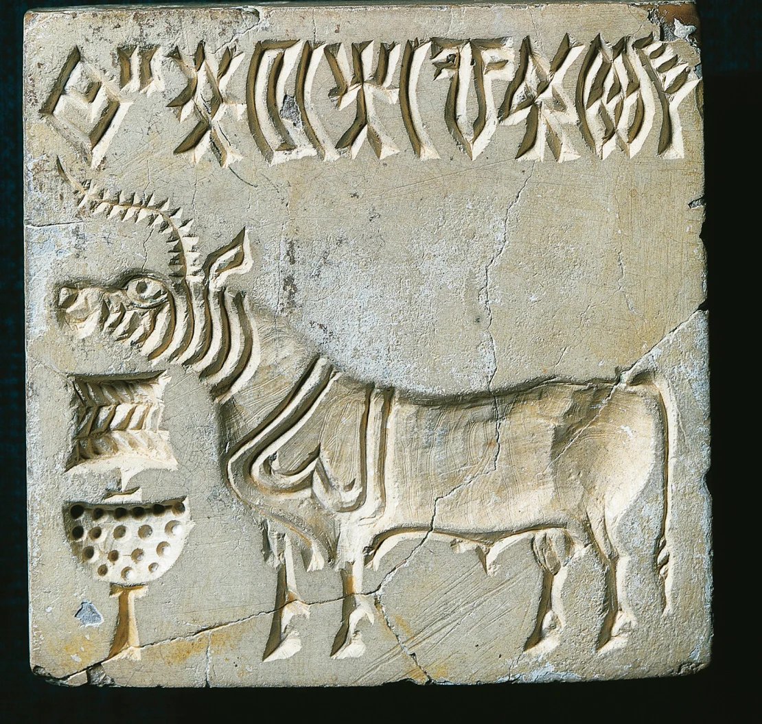 Një vulë guri e mbishkruar me shkrimin e Luginës Indus dhe që përshkruan një rinoceront indian, e gjetur në Mohenjo-daro