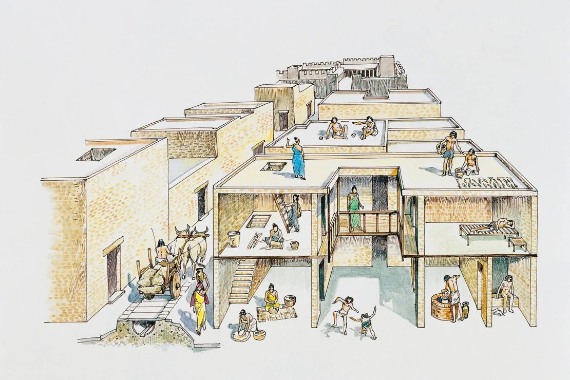 Ky ilustrim tregon një pjesë të brendshme të rindërtuar të një ndërtese banimi nga Mohenjo-daro e qytetërimit Indus