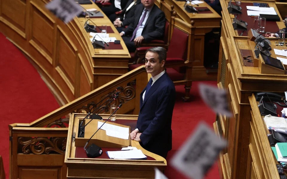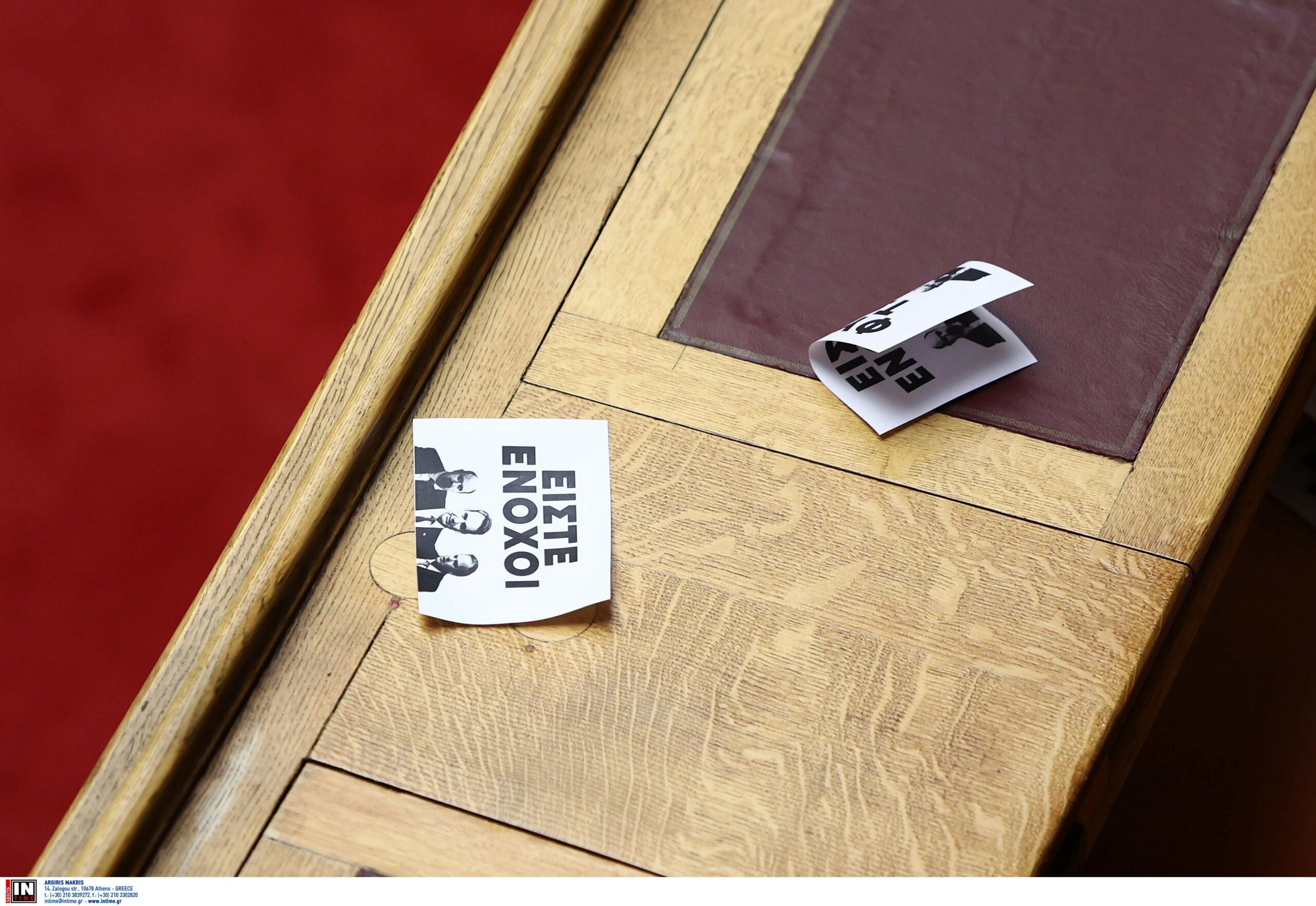 Në fillim të fjalimit të kryeministrit Kyriakos Mitsotakis në Parlament, gjatë debatit për një mocion mosbesimi mbi trajtimin nga qeveria të katastrofës hekurudhore me 57 viktima, protestuesit në hollin e vizitorëve hodhën fletushka dhe brohoritën me zë të lartë “fajtor”, duke ndërprerë shkurtimisht seancën.