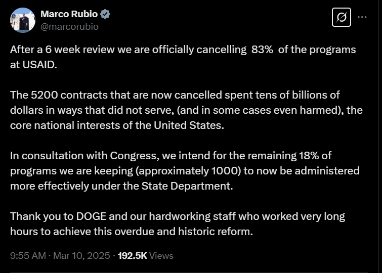 Në fund ai falënderon departamentin e drejtuar nga Elon Musk, DOGE, dhe shton se kontratat e mbetura do administrohen në mënyrë më efektive nga Departamenti i Shtetit.