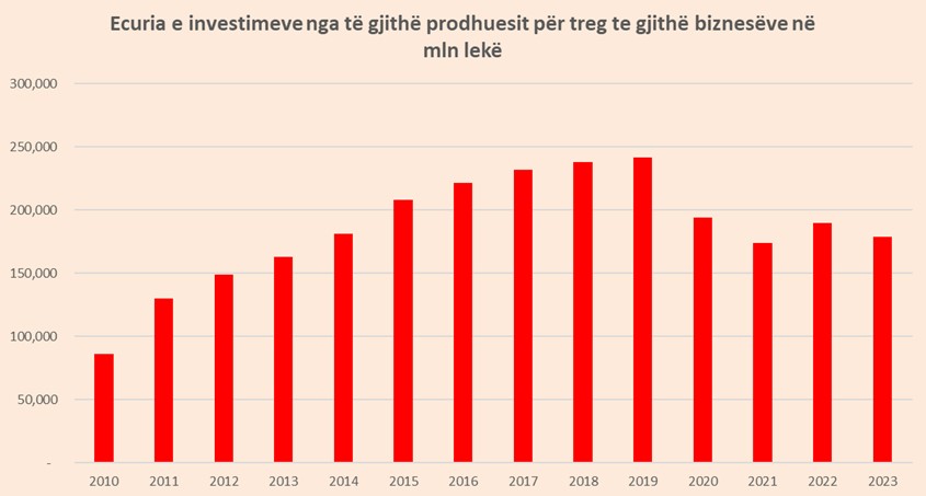 Përgjatë 2020-2023 investimet e bizneseve pësuan rënie të ndjeshme. Në vitin 2020-2021 si rrjedhojë e kufizimeve pandemike rënia e investimeve është e shpjegueshme, por trendi rënës vijoi edhe në 2023.