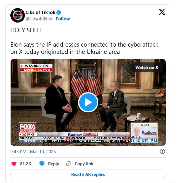 “Por pati një sulm masiv kibernetik në përpjekje për të rrëzuar sistemin e X, me adresa IP me origjinë nga zona e Ukrainës.”