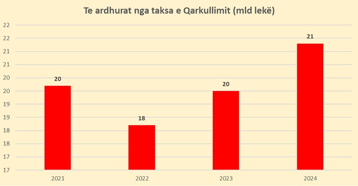 Në vitin 2024 Ministria e Financave kishte programuar të vilte 23,3 miliardë lekë nga taksa e qarkullimit, por janë arkëtuar 21.3 miliardë lekë, me një mosrealizim në vlerë 2 miliardë lekë.