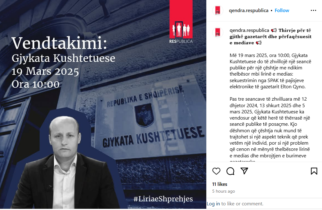 “Më 19 mars 2025, ora 10:00, Gjykata Kushtetuese do të zhvillojë një seancë publike për një çështje me ndikim thelbësor mbi lirinë e medias: sekuestrimin nga SPAK të pajisjeve elektronike të gazetarit Elton Qyno.