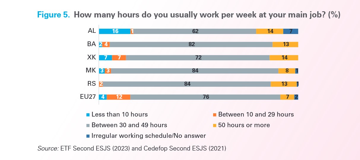 Anketa vëren se shumica e punonjësve në Ballkan kanë orare të rregullta pune, kryesisht ndërmjet 30 dhe 49 orë në javë. Megjithatë, 8% e të punësuarve në Maqedoninë e Veriut në 14% në Shqipëri dhe Kosovë punojnë më shumë se gjatë 50 orë pune në javë.
