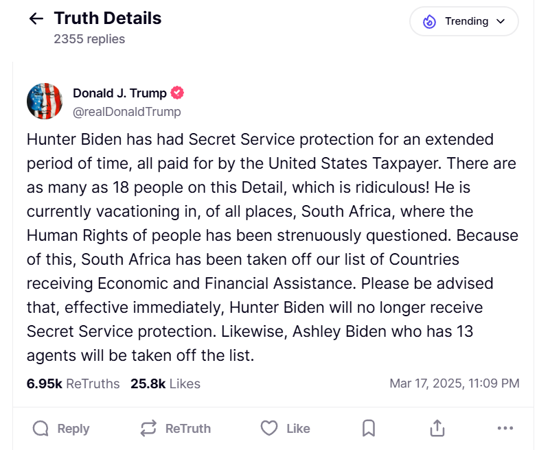 Në një postim të Truth Social, Trump vuri në dukje se Hunter Biden ka marrë mbrojtje të Shërbimit Sekret për një “periudhë të zgjatur kohore”.
