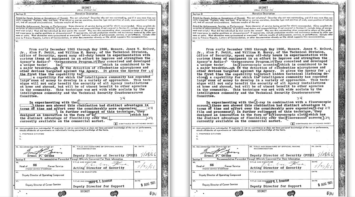 Një rekomandim vlerësimi për James W. McCord Jr. – një punonjës i nivelit të lartë të CIA-s për një kohë të gjatë, i cili më vonë u dënua për vjedhjen e Watergate – thotë se ai luajti një rol të rëndësishëm në zhvillimin e “skanimit fluoroskopik” që i mundësoi CIA-s të “zbulonte pajisje teknike dëgjimi të fshehura” për herë të parë.