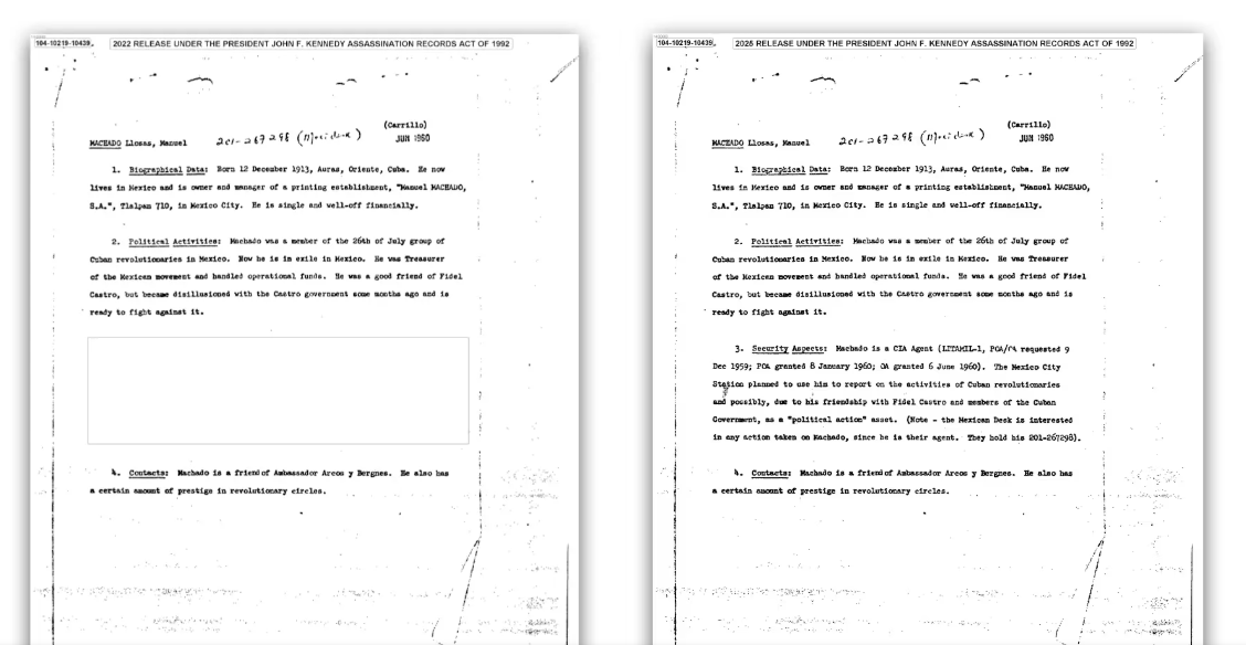Ky dokument me një faqe zbulon se Manuel Machado Llosas – arkëtar i lëvizjes revolucionare meksikane dhe mik i presidentit kuban dhe diktatorit Fidel Castro – ishte një agjent i CIA-s. Machado Llosas ishte planifikuar të vendosej në Mexico City, ku dokumenti thotë se CIA planifikoi ta “përdorte atë për të raportuar mbi veprimtarinë e revolucionarëve kubanë” dhe të përdorte miqësinë e tij me Kastron dhe krerët e tjerë kubanë, në mënyrë që ai të mund të vepronte si një “aset “për veprim politik”.