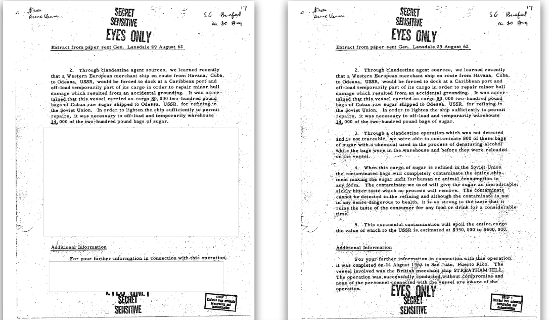 Në një operacion të fshehtë, CIA ndoti 800 thasë me sheqer të papërpunuar në një anije mallrash që udhëtonte nga Kuba për në Bashkimin Sovjetik, thotë një pjesë e saporedaktuar e këtij dokumenti.
