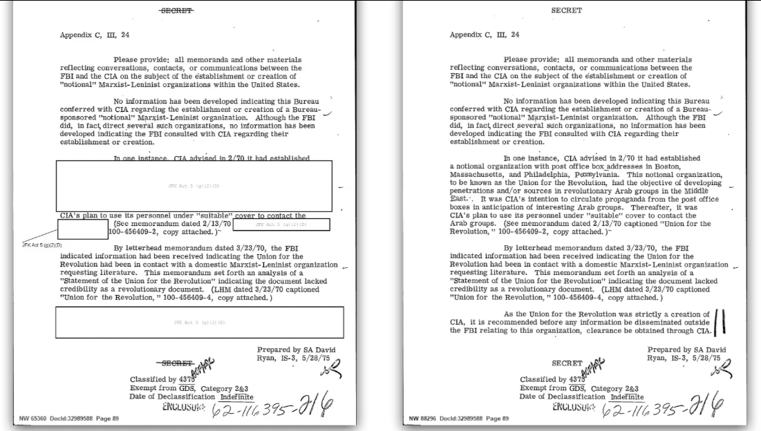Një faqe e saporedaktuar e këtij dokumenti i referohet një memoje të CIA-s që zbulon se agjencia kishte krijuar një organizatë të rreme, të quajtur “Union për Revolucionin”, me adresa të kutive postare në Boston dhe Filadelfia.