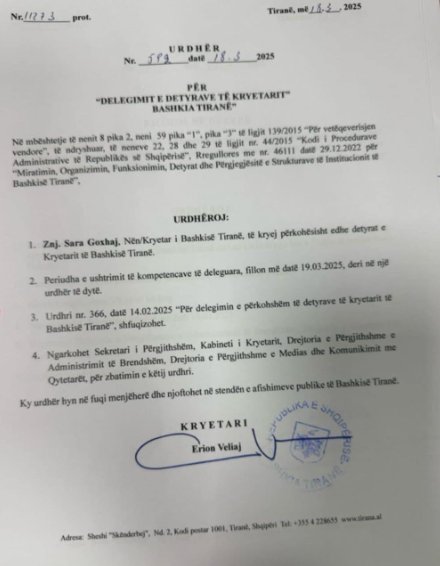 “Urdhëroj: znj. Sara Goxhaj nënkryetare e Bashkisë së Tiranës, të kryejë përkohësisht edhe detyrat e Kryetarit të Bashkisë së Tiranës. Periudha e ushtrimit të kompetencave të deleguara, fillon në datë 19.03.2025 deri në një urdhër të dytë. Urdhri nr 366, date 14.02.2025 ‘për delegimin e përkohshëm të detyrave të Bashkisë së Tiranës’, shfuqizohet’”, thuhet në urdhrin e firmosur nga Veliaj dhe që është protokolluar me numër 11273.