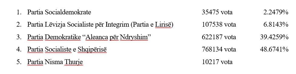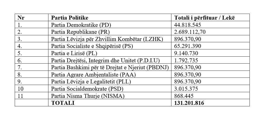 Partia Socialiste, si forca kryesore në vend, do të përfitojë mbi 65 milionë lekë të reja, ndërsa Partia Demokratike, si opozita kryesore, do të marrë 44.8 milionë lekë. Fondet e mbetura do të ndahen mes Partisë së Lirisë me 9 milionë lekë, Partisë Socialdemokrate me 3 milionë lekë, Partisë Republikane me 2.6 milionë lekë dhe PDIU me 1.7 milionë lekë.